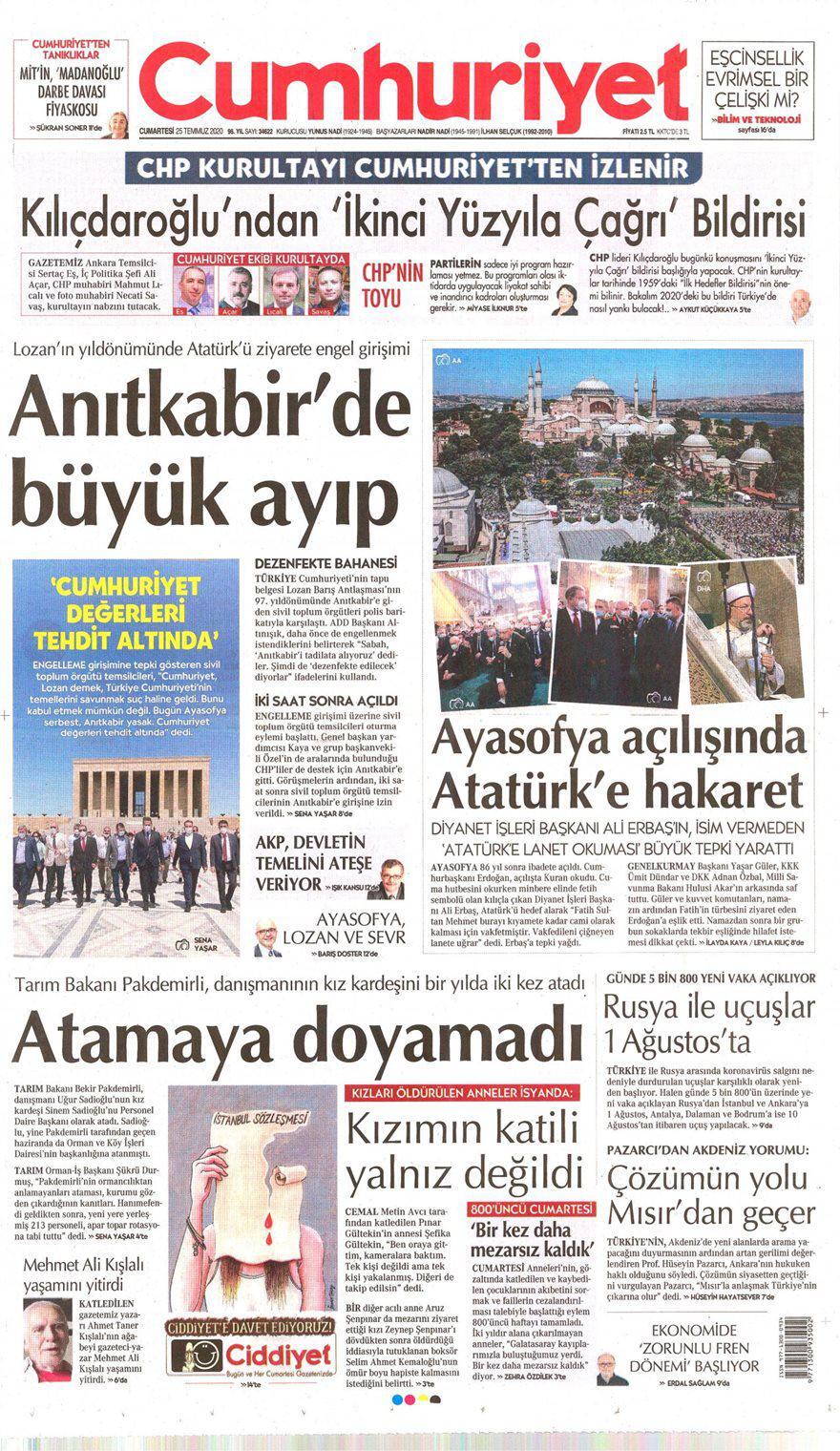 Εξαίρεση αποτελεί η φιλικά προσκείμενη στην αντιπολίτευση εφημερίδα Cumhuriyet (Τζουμχουριγιέτ) που στο πρωτοσέλιδο έχει τίτλο «Προσβολή στον Κεμάλ», αναφερόμενη στην ομιλία του Προέδρου θρησκευτικών υποθέσεων και ανώτατου ιμάμη Αλί Ερμπάς, που από άμβωνος και κρατώντας το οθωμανικό ξίφος στα χέρια, είπε ότι όποιος άλλαξε την χρήση της Αγίας Σοφίας είναι καταραμένος