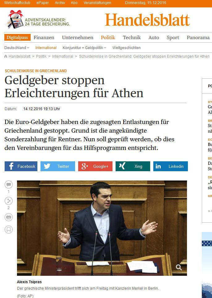 «Η Ελλάδα θέλει να δώσει στους συνταξιούχους επίδομα για τα Χριστούγεννα. Οι πιστωτές της χώρας αντιδρούν βάζοντας στον πάγο προαποφασισμένα μέτρα. Ο πρωθυπουργός Τσίπρας αμύνεται», προσθέτει η γερμανική εφημερίδα Frankfurter Allgmeine