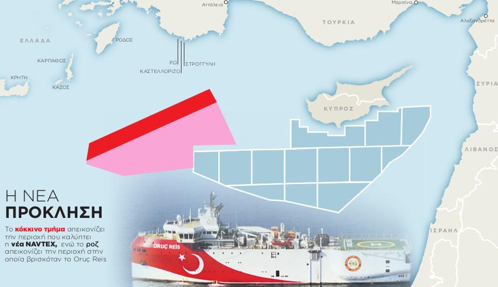 Μαζί με το τουρκικό σεισμογραφικό πλέουν τα βοηθητικά πλοία «Ataman» και «Cengiz Han» και όλα τους συνοδεύονται από πολεμικά της γείτονος. Τη νέα Navtex είχε προαναγγείλει από χθες το πρωί η ερντογανική εφημερίδα «Γενί Σαφάκ». Με τη νέα Navtex για το «Oruc Reis» οι Τούρκοι επιμένουν να κινούνται πάνω στην ίδια γραμμή κάτω από το Καστελλόριζο και κοντά σε Ρόδο και Κρήτη.