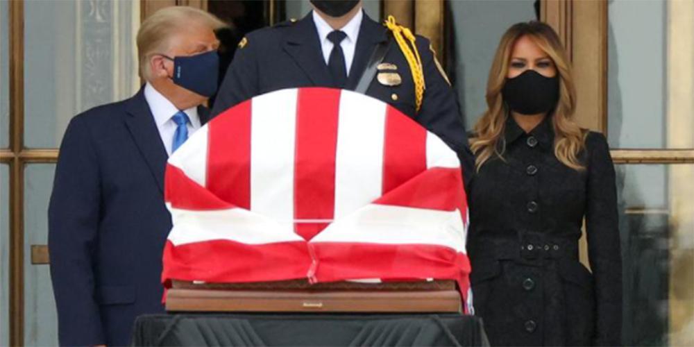 Φορώντας μαύρη μάσκα και συνοδευόμενος από τη σύζυγό του Μελάνια, που ήταν επίσης ντυμένη στα μαύρα, ο Αμερικανός πρόεδρος στάθηκε σιωπηλός για μερικά λεπτά πίσω από το φέρετρο της Γκίνσμπεργκ που ήταν καλυμμένο με την αμερικανική σημαία.