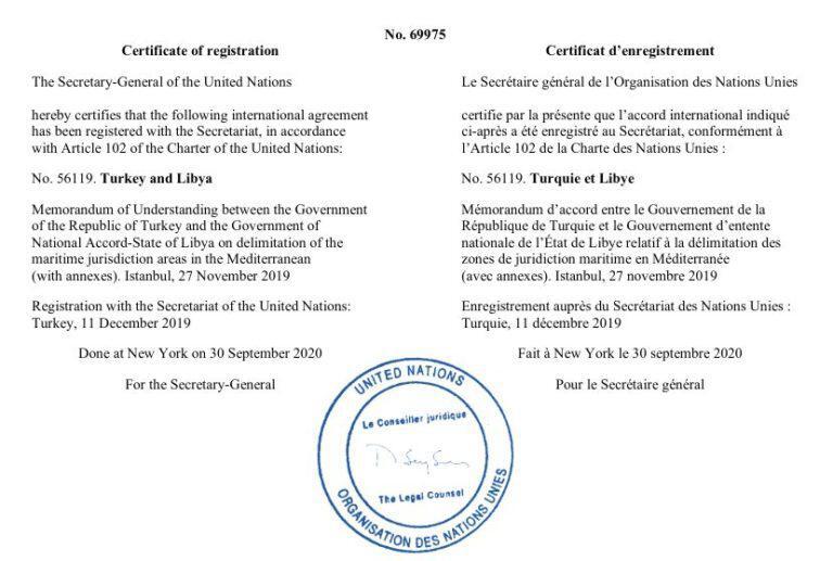 Σύμφωνα με το πιστοποιητικό καταχώρισης που εκδόθηκε από τον Γενικό Γραμματέα των Ηνωμένων Εθνών, Αντόνιο Γκουτέρες, «ο ΓΓ με το παρόν πιστοποιεί ότι η διεθνής συμφωνία που υπεγράφη μεταξύ Τουρκίας και Λιβύης εγγράφηκε σύμφωνα με το Άρθρο 102 του Χάρτη των Ηνωμένων Εθνών στις 30 Σεπτεμβρίου».