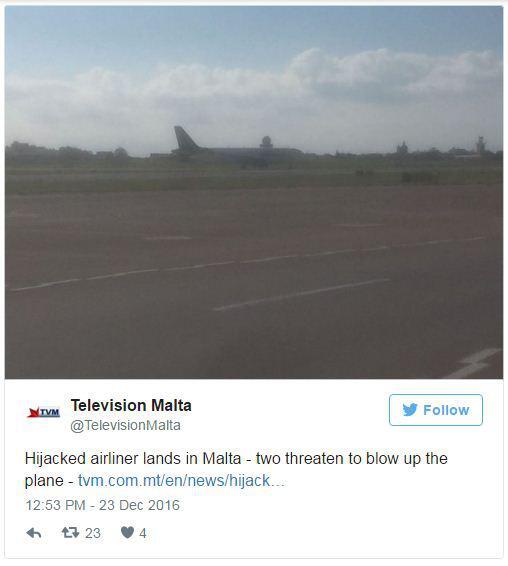 Σύμφωνα με την ίδια πηγή, το αεροσκάφος προσγειώθηκε στη Μάλτα και οι δύο αεροπειρατές απείλησαν να το ανατινάξουν χωρίς να έχουν γίνει γνωστά τα αιτήματά τους.