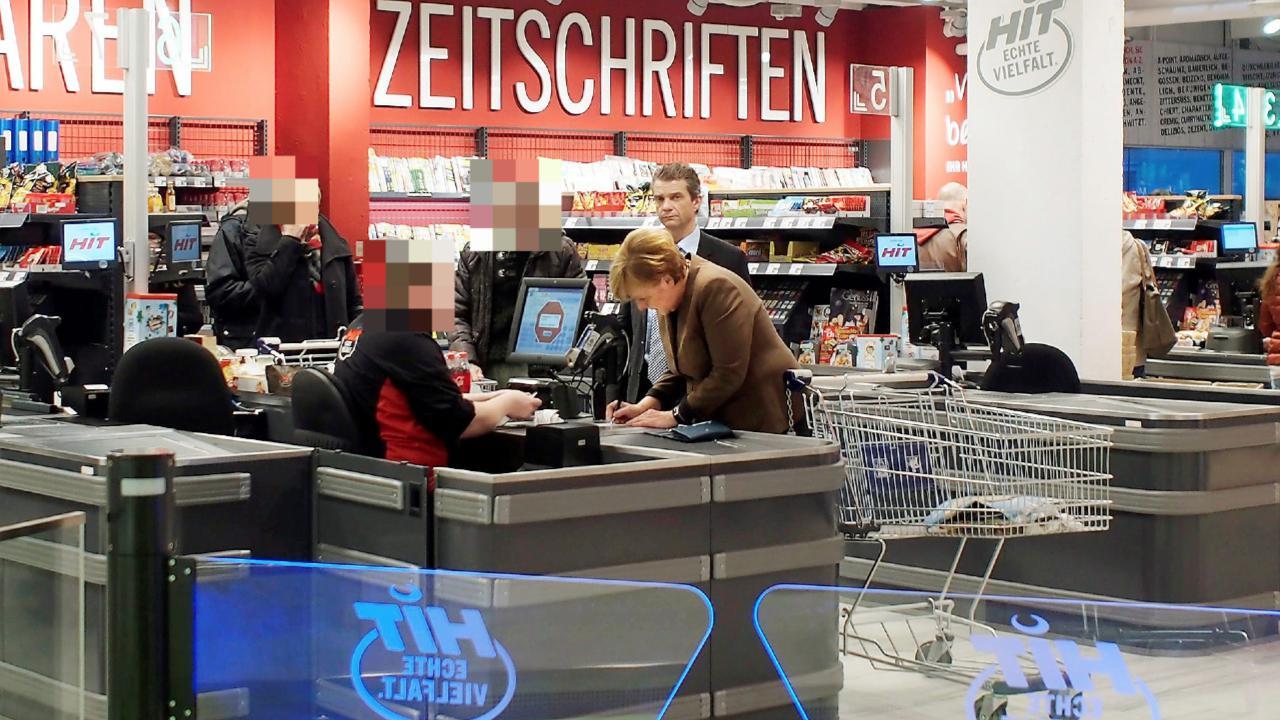 Εκεί σύμφωνα με την γερμανική εφημερίδα Bild πλήρωσε βούτυρο, πιπέρι, πατάτες, τυρί αλλά και ένα κουτί σοκολατάκια (οικογενειακή συσκευασία Mon Cheri αξίας 4,99 ευρώ).
