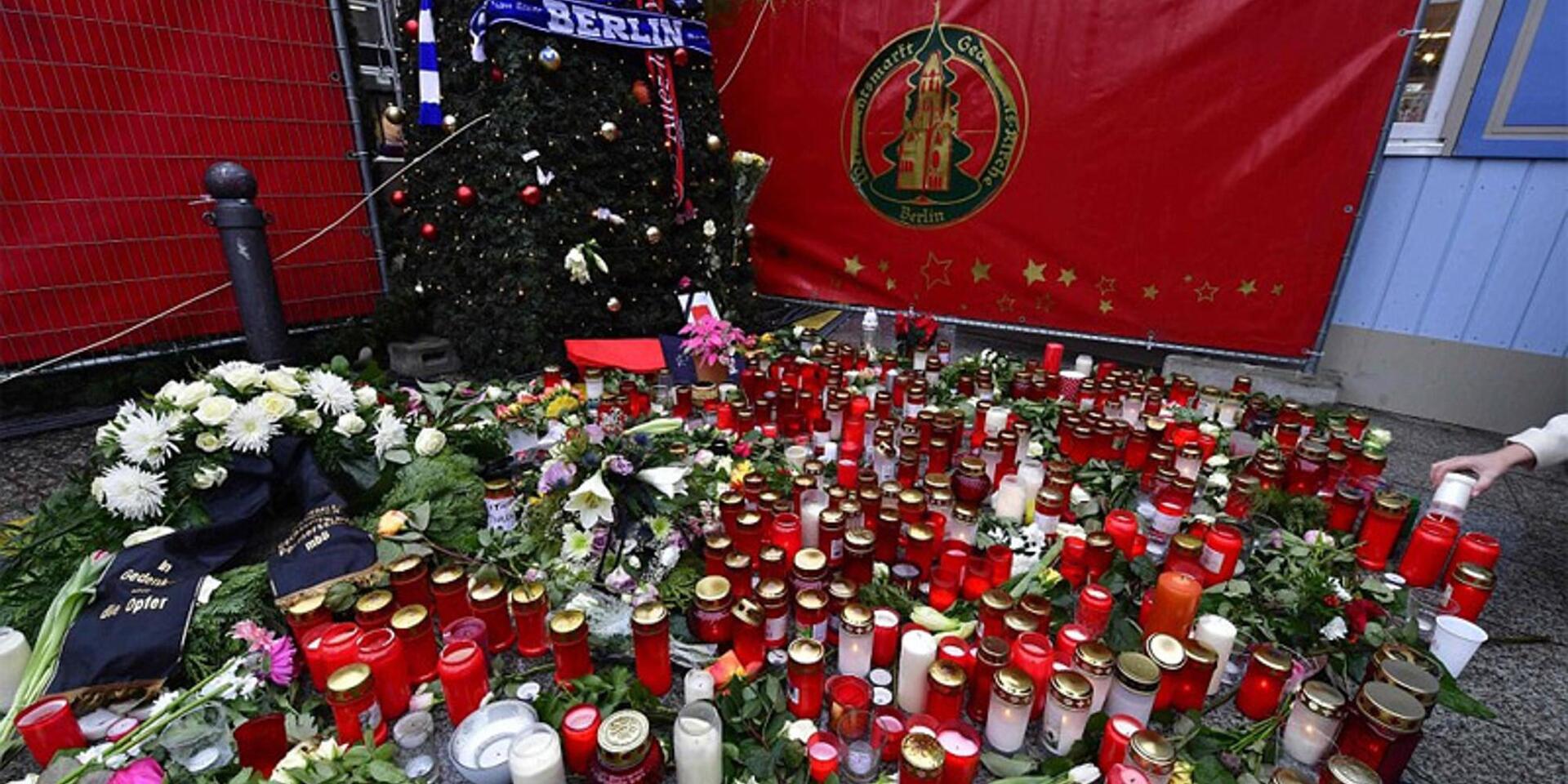 Οι μπάλες του στολισμένου δέντρου στη χριστουγεννιάτικου αγορά του Βερολίνου καθρεφτίζουν το φως των κεριών που άναψαν στην μνήμη των ανθρώπων που χάθηκαν.
