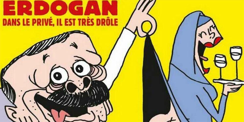 Πρωταγωνιστής του εξώφυλλου του περιοδικού είναι ο Πρόεδρος της Τουρκίας, Ρετζέπ Ταγίπ Ερντογάν, ο οποίος φαίνεται να σηκώνει το ρούχο μιας μουσουλμάνας, η οποία κάτω από το ρούχο είναι γυμνή, και απεικονίζεται να αναφωνεί «Ωωω ο Προφήτης!». Μάλιστα, η λεζάντα του πρωτοσέλιδου γράφει «ΕΡΝΤΟΓΑΝ. Στα απόκρυφά του, είναι αστείος».