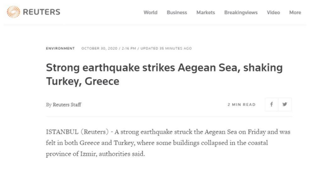 «Δυνατός σεισμός χτύπησε το Αιγαίο, “κουνώντας” Τουρκία και Ελλάδα» είναι ο τίτλος του πρακτορείου ειδήσεων Reuters, το οποίο αναφέρει ότι οι κάτοικοι της Σάμου ειδοποιήθηκαν να παραμένουν μακριά από τις παράκτιες περιοχές.