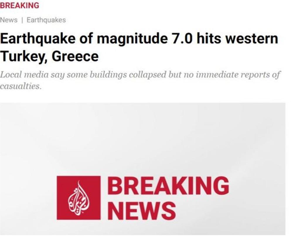 Την ίδια ώρα, το αραβικό Al Jazeera αναφέρει πως το Αμερικανικό Γεωλογικό Ινστιτούτο ανέβασε το μέγεθος της δόνησης στα 7 Ρίχτερ, ενώ προσθέτει πως ο σεισμός έγινε αισθητός από την Κρήτη μέχρι και την Κωνσταντινούπολη.