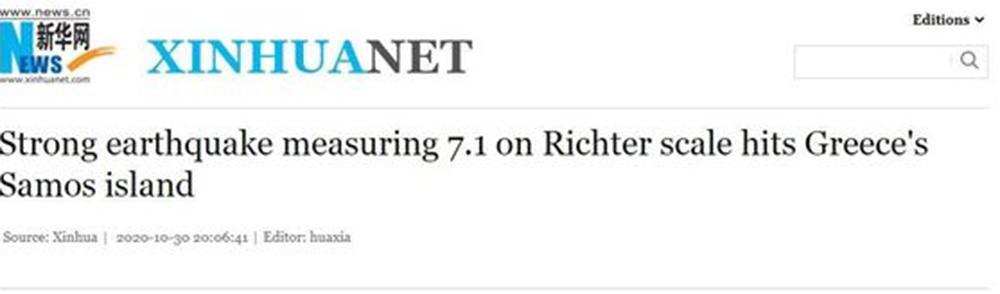 Το κινεζικό πρακτορείο ειδήσεων Xinhua αναφέρει ότι ο σεισμός που χτύπησε τη Σάμο ήταν μεγέθους 7,1 Ρίχτερ, επικαλούμενο το Γερμανικό Ερευνητικό Κέντρο Γεωεπιστημών.
