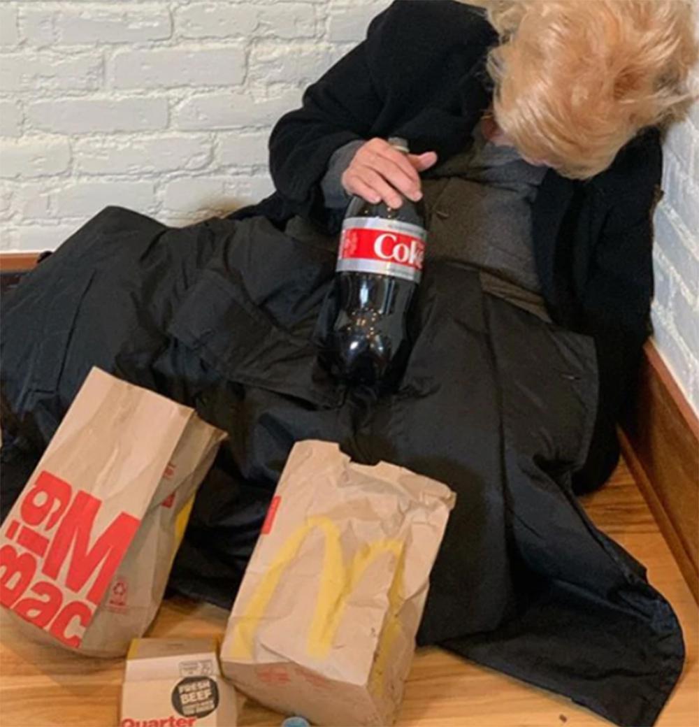 Οπως φαίνεται οι φωτογραφίες έχουν… κίνηση. Δείχνουν αρχικά πως φτάνει με τις σακούλες στα χέρια μετά την ήττα του στο σημείο που απομονώνεται σαν άστεγος, κάθεται στο πάτωμα, κρατά άδειες σακούλες και κουτιά από τα McDonald’s πίνοντας κόκα κόλα από το μπουκάλι.