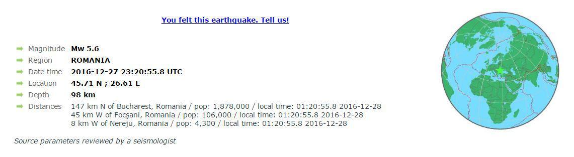 Το επίκεντρο της δόνησης εντοπίζεται 154χλμ. βόρεια του Βουκουρεστίου, ενώ το εστιακό βάθος του σεισμού υπολογίζεται στα 100χλμ.