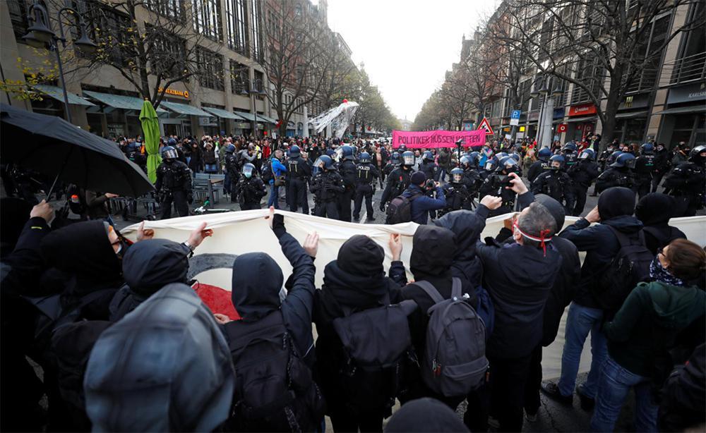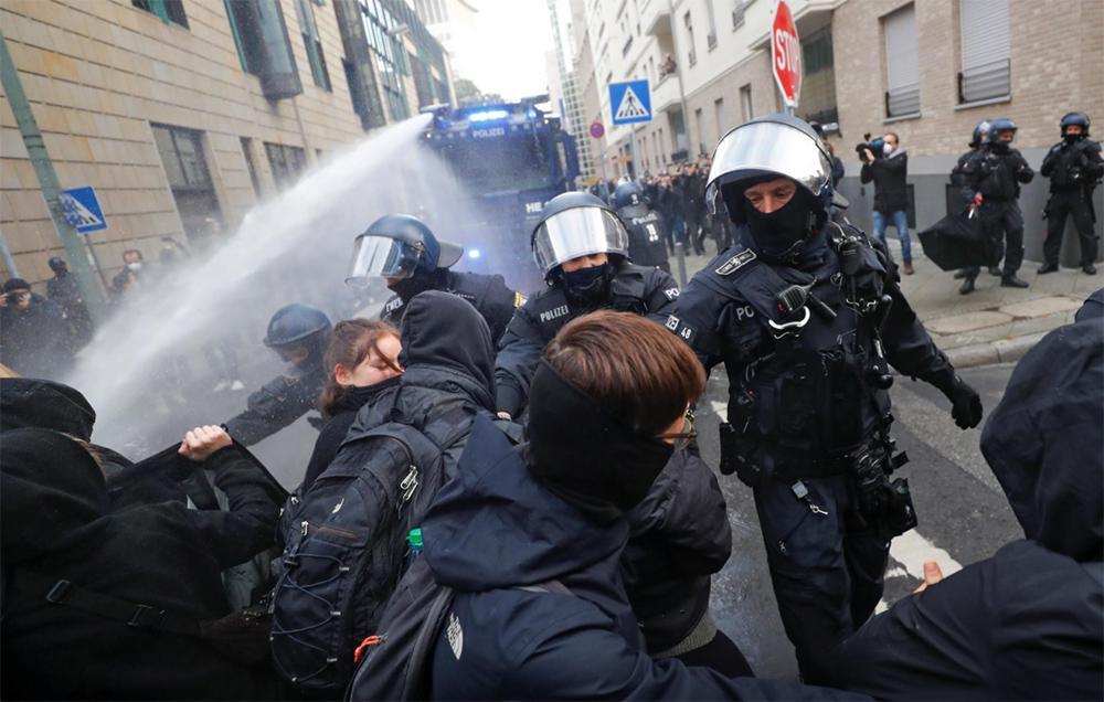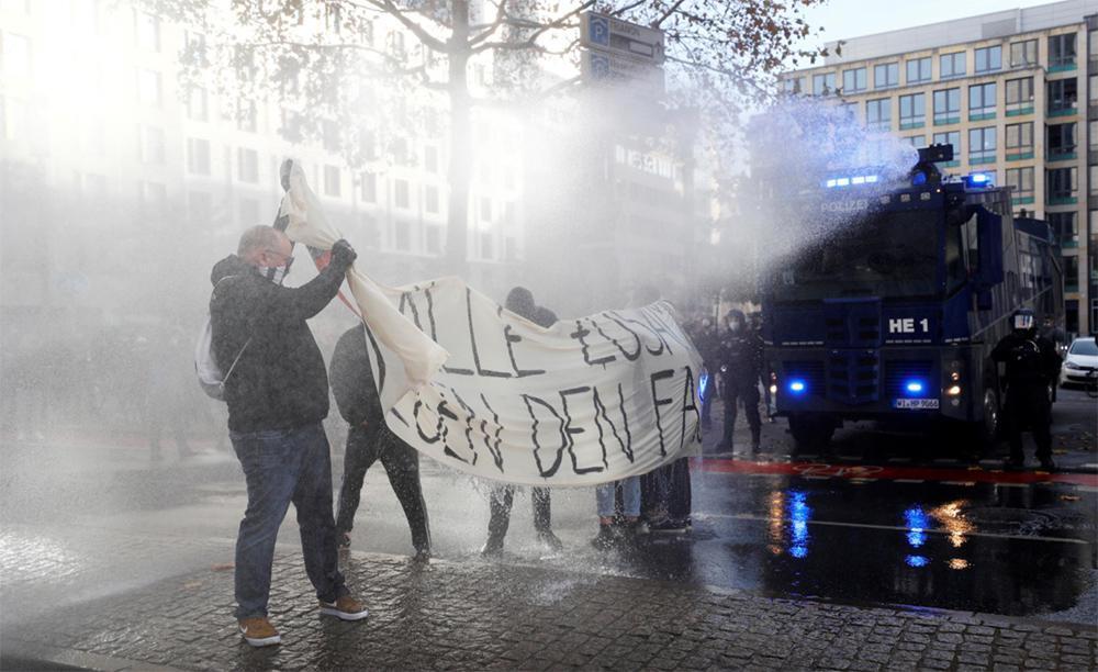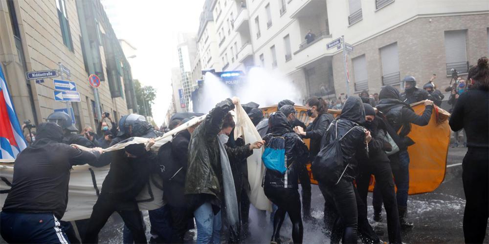 Οι αστυνομικοί αρχικά έκαναν χρήση νερού υπό πίεση για να ανοίξουν τον δρόμο στους διαδηλωτές, επειδή τον έκλεισαν κατ’ επανάληψη περίπου 300 αντιδιαδηλωτές. Ένας εκπρόσωπος της αστυνομίας είπε όμως ότι και η πρώτη διαδήλωση τελικά διαλύθηκε με τον ίδιο τρόπο, επειδή οι συμμετέχοντες αγνόησαν τις προτροπές να φορέσουν μάσκα και να τηρούν τις αποστάσεις μεταξύ τους.