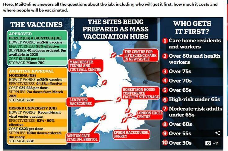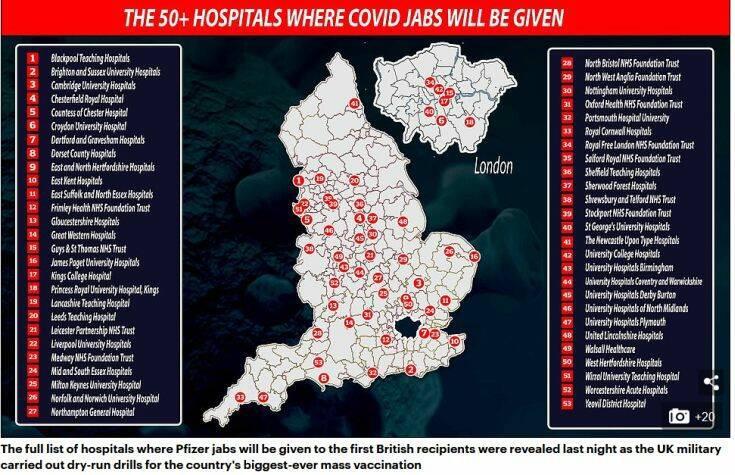 Σύμφωνα με την Daily Mail, 50 νοσοκομεία είναι έτοιμα να υποδεχτούν το εμβόλιο της Pfizer για την πρώτη από τις δύο δόσεις του εμβολίου που πήρε έγκριση στο Ηνωμένο Βασίλειο χθες. Συνολικά 40 εκατομμύρια εμβόλια θα ξεκινήσουν να χορηγούνται στους πολίτες της Βρετανίας από την επόμενη εβδομάδα.