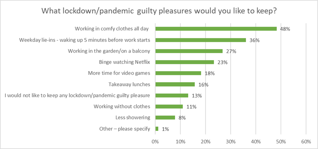 Συνεχίζοντας να ανακαλύπτουν τα προνόμια του νέου φυσιολογικού, το 27% των ανθρώπων απολαμβάνουν να εργάζονται έξω στον κήπο ή σε μπαλκόνι, και το 23% καταφέρνει ακόμη και να παρακολουθεί Netflix εν ώρα εργασίας. Άλλες απολαύσεις που προτιμούν οι υπάλληλοι περιλαμβάνουν περισσότερο χρόνο για βιντεοπαιχνίδια (18%), γεύματα σε πακέτο (16%) και λιγότερο ντους (8%).