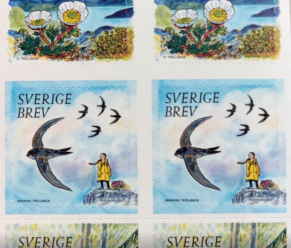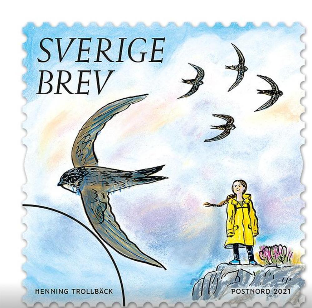 Τα γραμματόσημα θα πωλούνται από τα PostNord από την Πέμπτη και σε αυτά θα εμφανίζεται η νεαρή ακτιβίστρια να φοράει το γνωστό κίτρινο αδιάβροχό της και να στέκεται σε μια βραχώδη ακτή, ενώ αγναντεύει ένα σμήνος πουλιά.