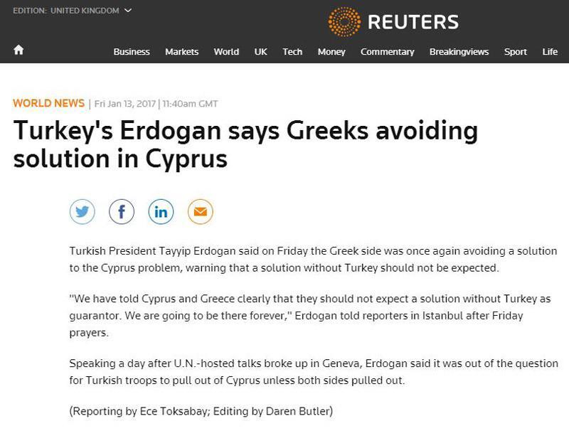 Πρόσθεσε ότι για να φύγουν τα τουρκικά στρατεύματα από την Κύπρο θα πρέπει να φύγουν και τα ελληνικά. Όπως μεταδίδει το Reuters ο Τούρκος πρόεδρος είπε επίσης: «Έχουμε πει ξεκάθαρα στην Κύπρο και την Ελλάδα ότι δεν θα πρέπει να περιμένουν μία λύση χωρίς την Τουρκία ως εγγυήτρια δύναμη. Θα είμαστε εκεί για πάντα!».