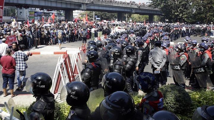 Δεκάδες χιλιάδες άνθρωποι συγκεντρώθηκαν στην οικονομική πρωτεύουσα Ρανγκούν και σε άλλες πόλεις για να διαμαρτυρηθούν για την ανατροπή της κυβέρνησης της Αούνγκ Σαν Σου Τσι. Στην πρωτεύουσα Ναϊπιντάου, οι δυνάμεις της τάξης έκαναν χρήση αντλιών νερού εναντίον των διαδηλωτών, σύμφωνα με δημοσιογράφους του AFP.