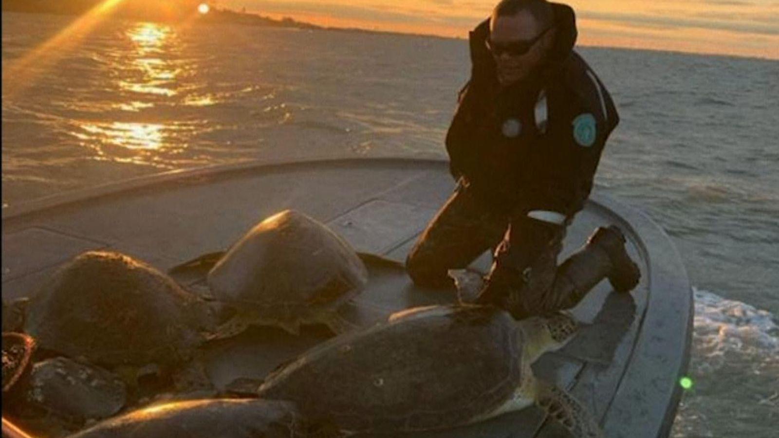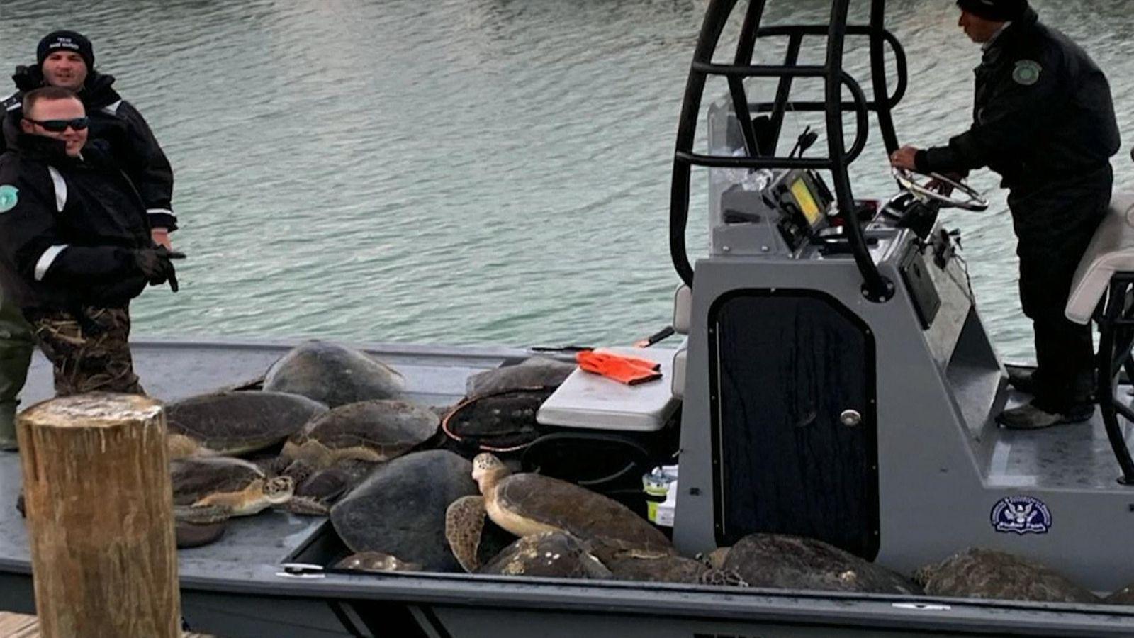 Οι χαμηλές θερμοκρασίες είχαν τεράστιες επιπτώσεις στις θαλάσσιες χελώνες, οι οποίες, ακινητοποιημένες από το κρύο, αδυνατούν να κολυμπήσουν και να βρουν τροφή.