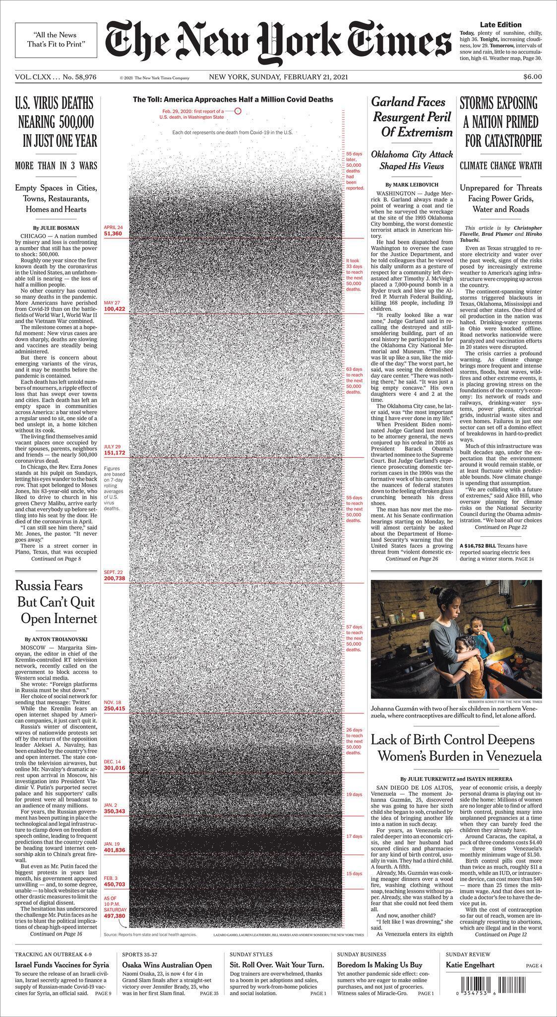 Μια μεγάλη στήλη, που συνεχώς μαυρίζει από κουκίδες θανάτων είναι το “συγκλονιστικό” πρωτοσέλιδο της εφημερίδας Times της Νέας Υόρκης.