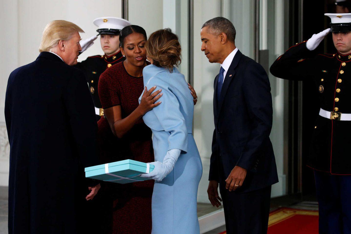 Ο Ομπάμα και ο Τραμπ αντάλλαξαν χειραψία στο κατώφλι του προεδρικού μεγάρου. Η Μελάνια με τη Μισέλ αντάλλαξαν ασπασμούς και η μέλλουσα πρώτη κυρία έδωσε στην οικοδέσποινα ένα δώρο, ένα αρκετά μεγάλο κουτί από το πασίγνωστο κατάστημα Tiffany & Co της Νέας Υόρκης.