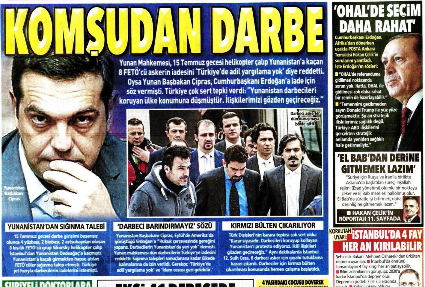 Η εφημερίδα SABAH στην έντυπη της έκδοση έχει τίτλο: Οι γείτονες έγιναν ασπίδα στους 8 πραξικοπηματίες προδότες