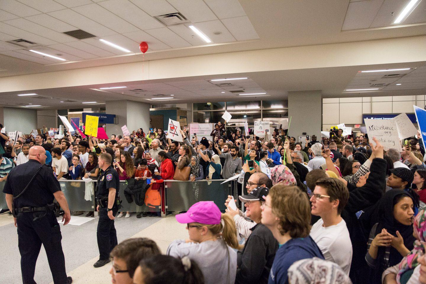 Διαμαρτυρίες έγιναν σε δεκάδες αεροδρόμια σε όλη τη χώρα. Εκατοντάδες συγκεντρώθηκαν στο αεροδρόμιο JFK στη Νέα Υόρκη, όπως και στα διεθνή αεροδρόμια του Λος Αντζελες, του Σαν Φρανσίσκο, του Χιούστον, της Φιλαδέλφεια και άλλων πόλεων στα οποία κρατούνταν άτομα. Στα αεροδρόμια όμως εκτυλίσσονταν και σκηνε αγωνίας, καθώς έσπευσαν εκεί συγγενείς ανθρώπων που κρατούνταν μετά την άφιξή τους στις ΗΠΑ.