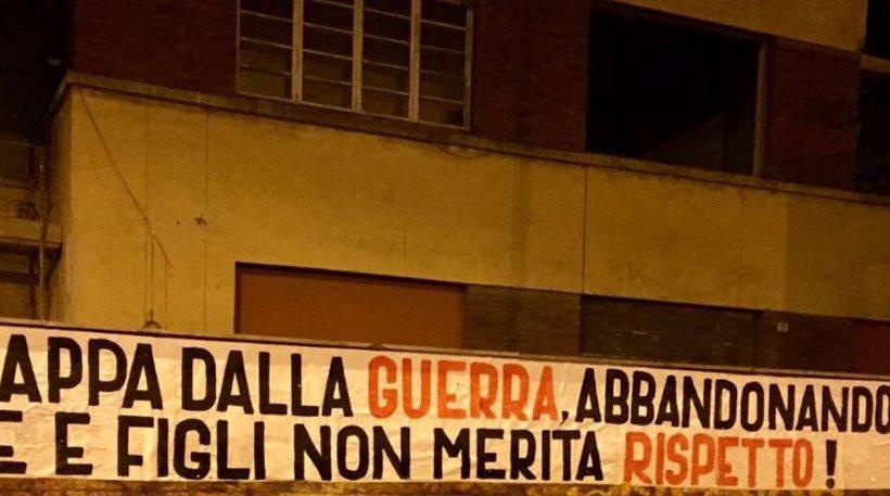 «Όποιος δραπετεύει από τον πόλεμο εγκαταλείποντας γονείς, γυναίκα και παιδιά, δεν αξίζει τον σεβασμό», διακηρύσσουν τα πανό αυτά που αναρτήθηκαν στις μεγάλες πόλεις καθώς και σε μικρές κοινότητες της βόρειας και της νότιας Ιταλίας, σύμφωνα με φωτογραφίες που δημοσιοποιήθηκαν από την οργάνωση στο Facebook.