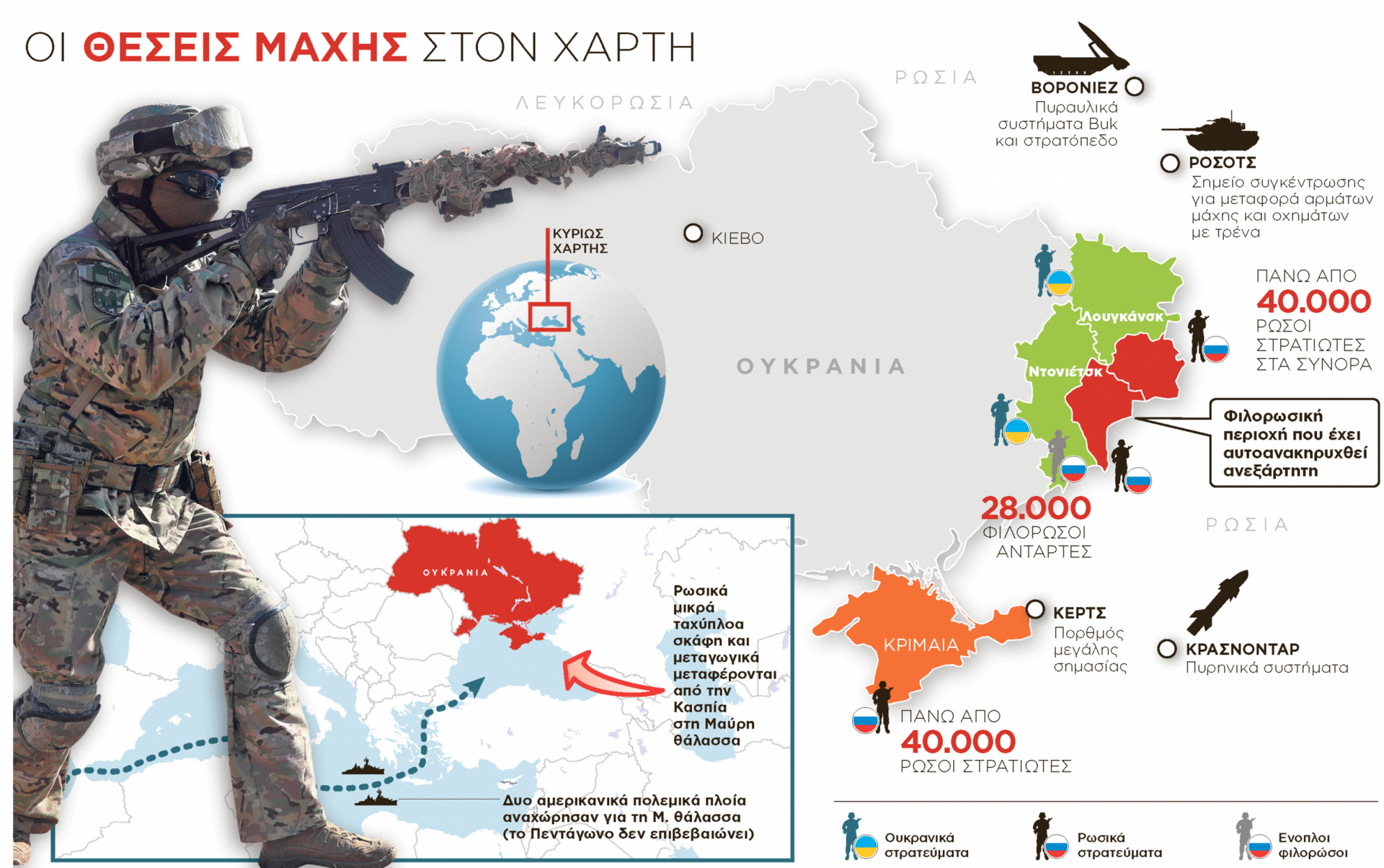 Εδώ και τέσσερις μήνες έχουν ξεκινήσει οι σποραδικές αψιμαχίες μεταξύ Ουκρανών και ρωσόφιλων ανταρτών στην περιοχή Ντονμπάς της Ανατολικής Ουκρανίας. Από την αρχή του χρόνου έχουν σκοτωθεί περισσότεροι από 25 Ουκρανοί στρατιώτες, κατ’ άλλους περισσότεροι. Η Ουκρανία πραγματοποίησε στρατιωτικά γυμνάσια με άρματα μάχης και πεζικό στην περιοχή της Χερσώνας, κοντά στα σύνορα με την Κριμαία, αντιδρώντας στη μεγάλη συγκέντρωση δυνάμεων κατά μήκος των ανατολικών συνόρων της Ουκρανίας καθώς και στη χερσόνησο. Το Κίεβο έχει κόψει την παροχή ύδρευσης στην Κριμαία και αυξάνει όλο και περισσότερο την ένταση με τη Μόσχα.