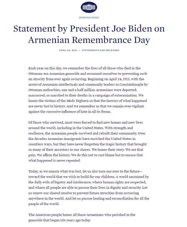Στις 12 ώρα ΗΠΑ ο Τζο Μπάιντεν έγινε ο πρώτος Αμερικάνος πρόεδρος που χαρακτήρισε τη σφαγή των Αρμενίων ως Γενοκτονία.