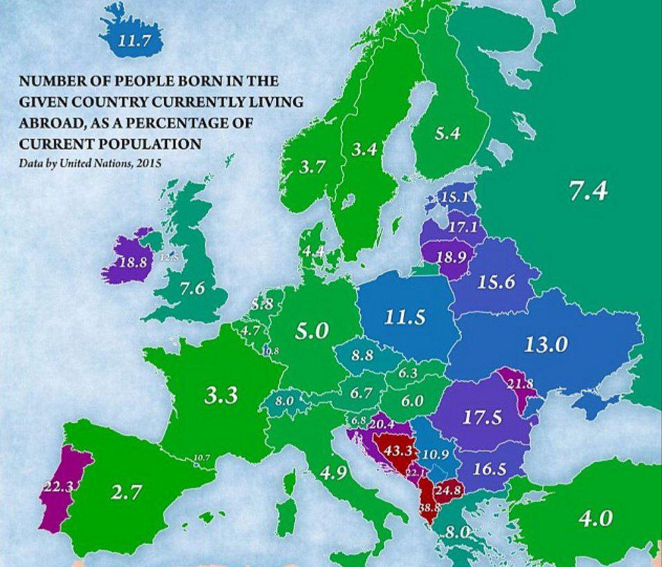 Η Ελλάδα βρίσκεται στην 14η θέση αφού έως το τέλος του 2015 είχε μεταναστεύσει το 8% του πληθυσμού της για κάποια άλλη χώρα της Ευρώπης.
