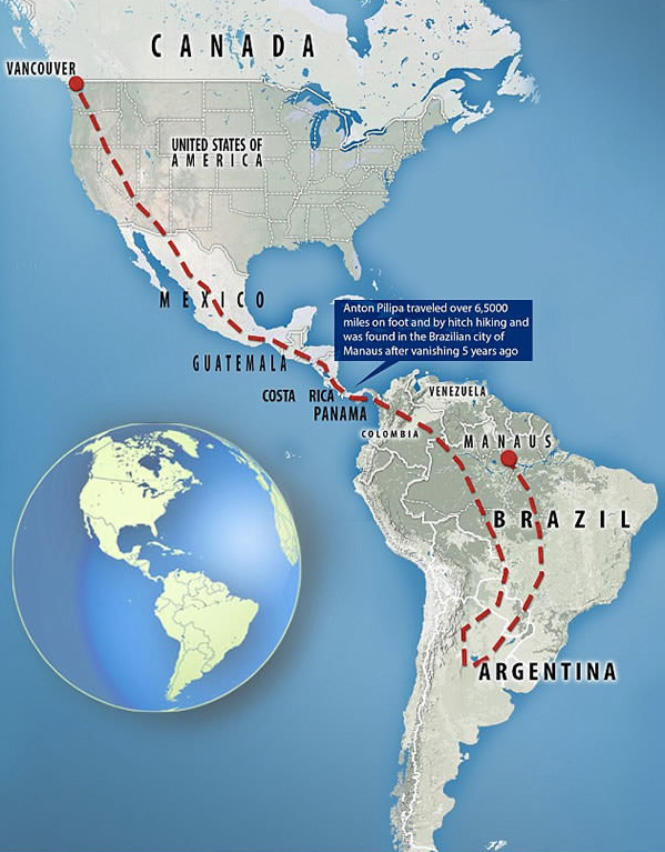 Για να καταλάβετε το μέγεθος του ταξιδιού, ο Αντόν «πέρασε» χωρίς διαβατήριο, χρήματα και μεταφορικό μέσο από τουλάχιστον δέκα χώρες: Καναδά, ΗΠΑ, Μεξικό, Γουατεμάλα, Κόστα Ρίκα, Παναμά, Κολομβία, Βενεζουέλα, Αργεντινή και τη Βραζιλία!