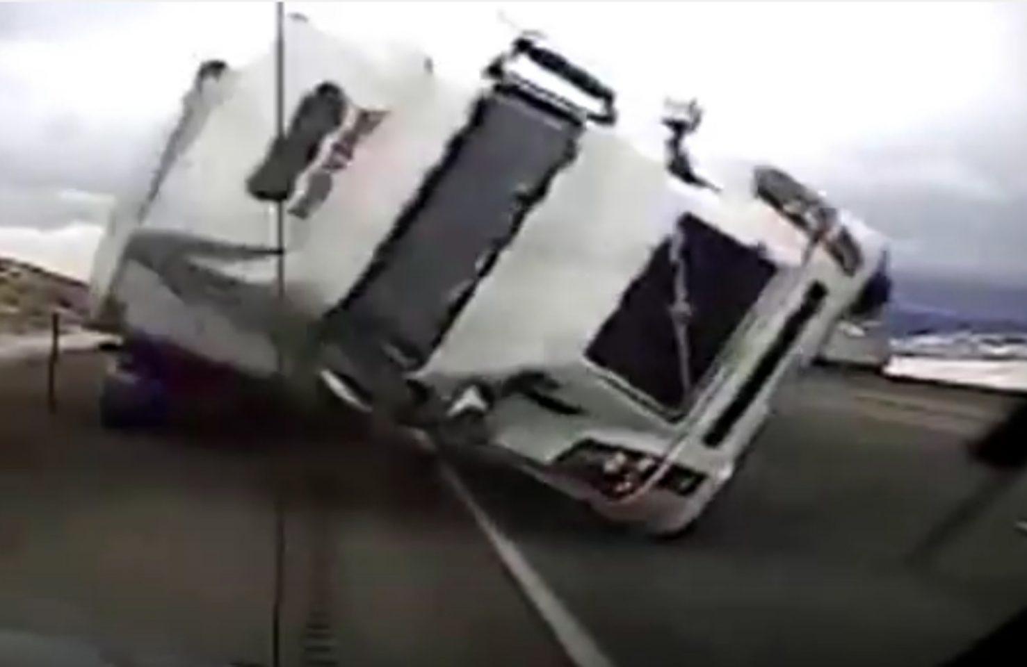 Ξαφνικά, ο ισχυρότατος πλάγιος άνεμος χτυπά με σφοδρότητα το 20μετρο όχημα. Η νταλίκα αρχίζει να βγαίνει εκτός ελέγχου και σε ελάχιστα κλάσματα δευτερολέπτου ανατρέπεται και προσγειώνεται ακριβώς πάνω στο περιπολικό, το οποίο συνέθλιψε κυριολεκτικά.