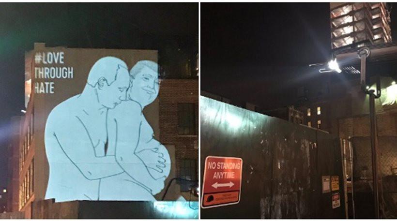 Η εικόνα είναι έργο της εφαρμογής γνωριμιών και ανεύρεσης συντρόφων «Hater» και προβλήθηκε σε δύο ακόμη κτίρια της Νέας Υόρκης. Ο ιδρυτής και Διευθύνων Σύμβουλος της εφαρμογής, Μπρένταν Άλπερr, δήλωσε στο «Business Insider» πως υπάρχει αρκετή ένταση αυτή τη στιγμή στη χώρα ανεξάρτητα το ποια πλευρά υποστηρίζει ο καθένας. Πρόσθεσε πως πρόθεση του προκλητικού installation ήταν να διασκεδάσει τον κόσμο και να τους κάνει να γελάσουν.
