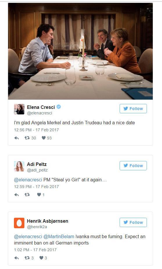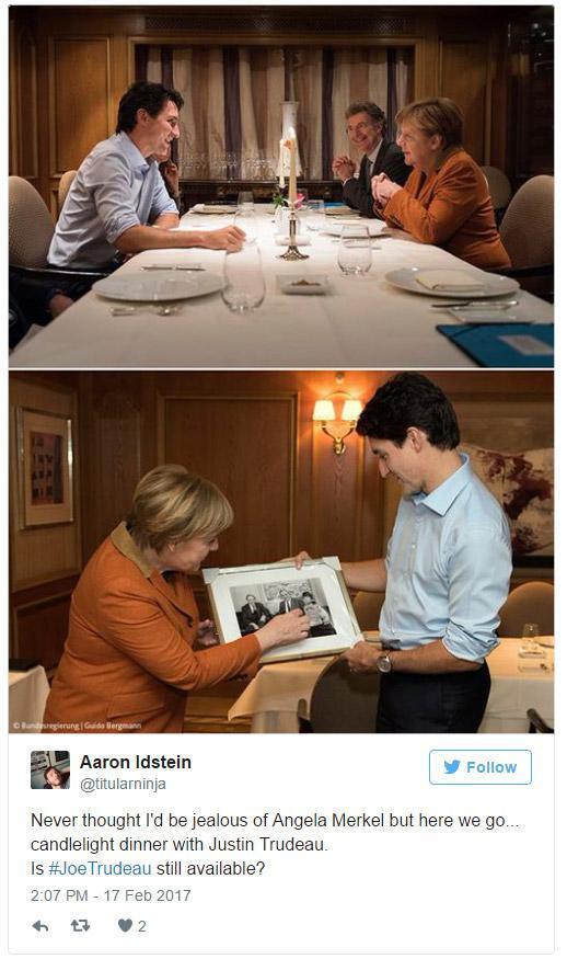 Αφού έκανε δώρο στον Καναδό πρωθυπουργό μία φωτογραφία του 1982, στην οποία απεικονίζεται ο ίδιος ο Τριντό, σε παιδική ηλικία, μαζί με τον πατέρα του, Πιέρ, τότε πρωθυπουργό του Καναδά, και τον τότε καγκελάριο της Γερμανίας, Χέλμουτ Κολ, η κυρία Μέρκελ δείπνησε μαζί του υπό το φως των κεριών, με την σχετική εικόνα να κάνει σχεδόν αμέσως τον γύρο του Διαδικτύου.