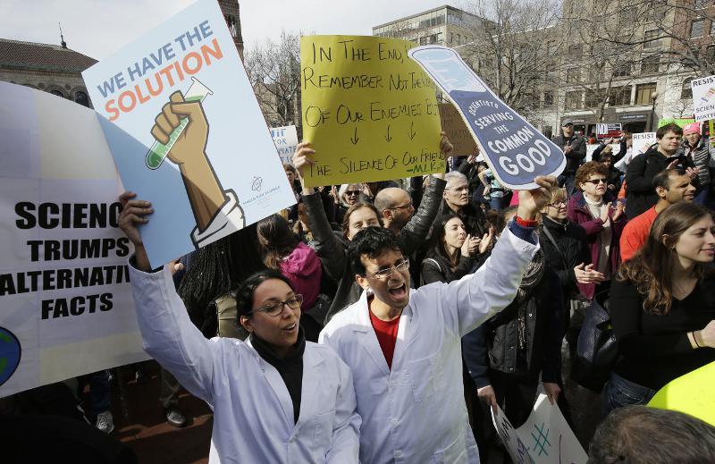 Έξω απ’ το χώρο του ετήσιου συνεδρίου της Αμερικανικής Ένωσης για την Πρόοδο της Επιστήμης (AAAS) στην πλατεία Κόπλεϊ της Βοστώνης, αρκετοί επιστήμονες μίλησαν με πάθος στο πλήθος που κράδαινε πλακάτ με συνθήματα όπως «Ξεσηκωθείτε για την Επιστήμη».