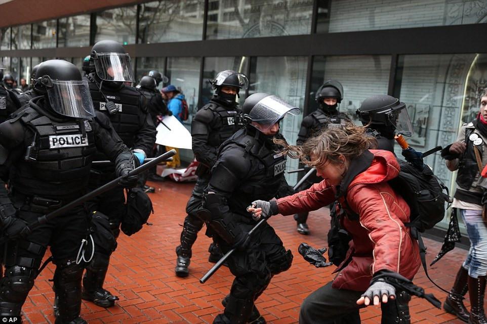 Τουλάχιστον 13 άτομα συνελήφθησαν από τις πάνοπλες δυνάμεις της αστυνομίας, οι άνδρες της οποίας δεν δίστασαν να επιτεθούν και να χτυπήσουν στο κεφάλι και στο σώμα ακόμα και ηλικιωμένες γυναίκες, οι οποίες έδωσαν το «παρών» στη διαδήλωση, προκειμένου να αποδοκιμάσουν τις αποφάσεις του Αμερικανού προέδρου. Σύμφωνα με τα αμερικανικά ΜΜΕ, η διαδήλωση δεν είχε εξασφαλίσει την απαιτούμενη άδεια και με βάση τη συγκεκριμένη δικαιολογία, δόθηκε η εντολή να διαλυθούν με τη βία οι συγκεντρωμένοι.