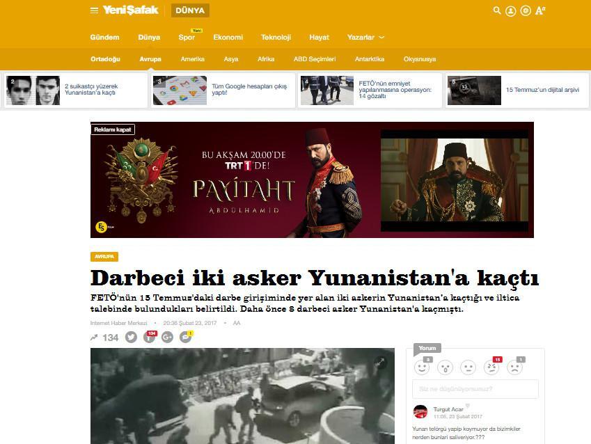 Η τούρκική ηλεκτρονική εφημερίδα κυκλοφορεί YENİ SAFAKμε τίτλο : «2 πραξικοπηματίες στρατιώτες διέφυγαν στην Ελλάδα»