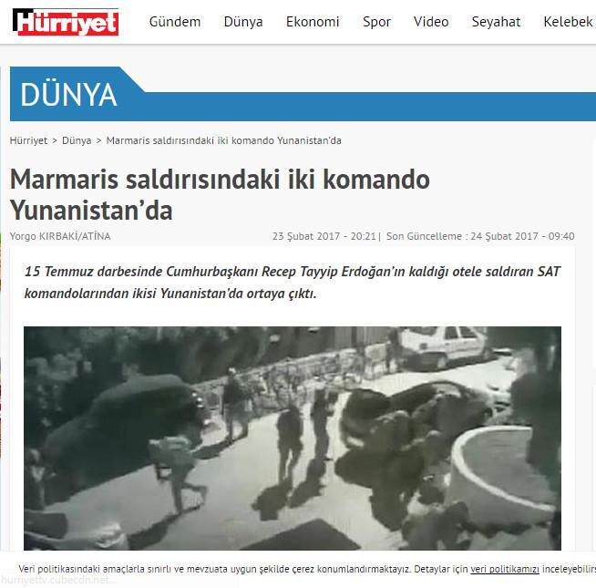 Η ηλεκτρονική έκδοση της εφημερίδας HURRIYET κυκλοφορεί με τίτλο: «Οι δυο τούρκοι κομάντο της επίθεσης της Μαρμαρίδας είναι στην Ελλάδα»