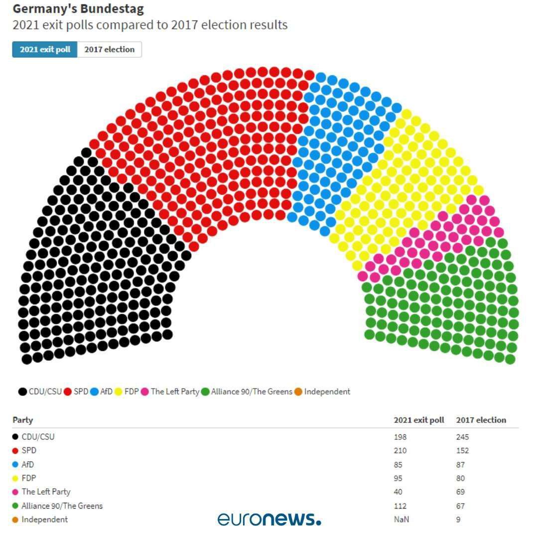 Αν δεν μεταβληθεί το αποτέλεσμα, τότε το κόμμα των Σοσιαλδημοκρατών θα είναι η ισχυρότερη δύναμη στη Γερμανία για πρώτη φορά από το 2002. Έπονται οι Πράσινοι, με ποσοστό 13,8%, το κόμμα των Ελεύθερων Δημοκρατών ( FDP) με 11,7%, το κόμμα «Εναλλακτική για τη Γερμανία» (AfD) με ποσοστό 10,9% και το κόμμα της Αριστεράς με ποσοστό 5%.
