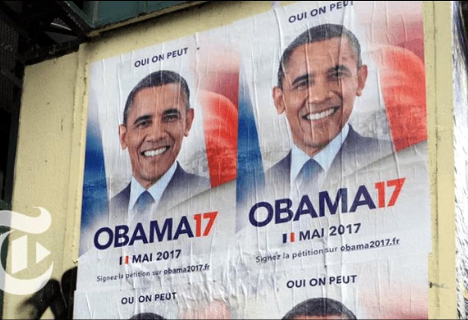 Μάλιστα έχουν τυπώσει αφίσες, υπάρχει προεκλογικό σύνθημα και φυσικά συλλογή υπογραφών και όλα αυτά προκειμένου να μπορέσει ο Μπαράκ Ομπάμα να κατεβεί υποψήφιος στις γαλλικές εκλογές. Σύμφωνα με τους εμπνευστές της πρωτοβουλίας η οποία πλέον μετρά πάνω από 40.000 υπογραφές, η επιλογή δεν έγινε για τις πολιτικές που ακολούθησε ο Ομπάμα. «Το γεγονός πως ήταν ο πρώτος Αφροαμερικανός πρόεδρος μπορεί να εμπνεύσει και να δώσει ελπίδα στον κόσμο για αλλαγή, για κάτι νέο, καινούργιο και άφθαρτο. Κάτι που δεν κάνουν οι υπάρχοντες υποψήφιοι», αναφέρουν.