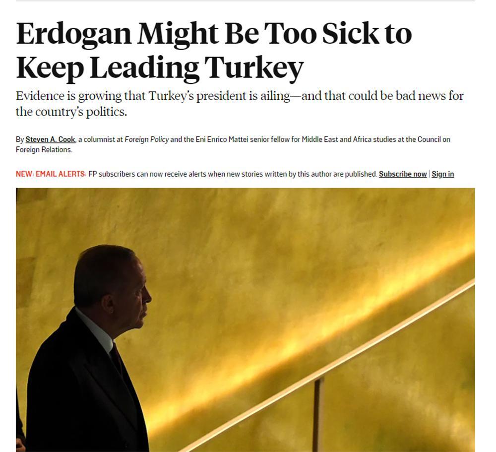 Το Foreign Policy αναφέρει ότι «ο Ερντογάν μπορεί να είναι πολύ άρρωστος για να συνεχίσει να ηγείται της Τουρκίας». Ο Τούρκος πρόεδρος μπορεί πράγματι να είναι ευάλωτος, αλλά όχι απαραίτητα με τον τρόπο που πιστεύουν οι περισσότεροι. Υπάρχουν ενδείξεις ότι μπορεί να είναι πολύ άρρωστος για να θέσει υποψηφιότητα για επανεκλογή, σύμφωνα με δημοσίευμα του έγκυρου Foreign Policy.