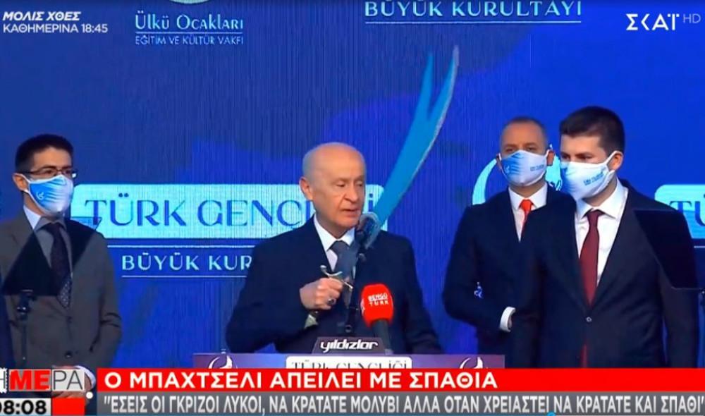Αυτή την φορά έμμεσο μήνυμα με… γιαταγάνι, ειδικά κατά των ΗΠΑ που εξετάζουν να κατατάξουν τους Γκρίζους Λύκους στη λίστα με τις τρομοκρατικές οργανώσεις, έστειλε ο Ντεβλέτ Μπαχτσελί απευθυνόμενος σε νέους που ανήκουν σε Γκρίζους Λύκους και εθνικιστές.