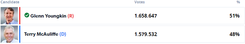 Ο Ρεπουμπλικανός επιχειρηματίας, Γκλεν Γιάνγκιν, ήταν αυτός που νίκησε τον πρώην κυβερνήτη στην κούρσα για τον κυβερνήτη της Βιρτζίνια την Τρίτη, πετυχαίνοντας ένα απρόσμενο πλήγμα στους Δημοκρατικούς ένα χρόνο πριν από τις εκλογές του 2022 που θα αποφασίσουν τον έλεγχο του Κογκρέσου και άλλων κρατικών αρχών σε εθνικό επίπεδο. To 51% των ψηφοφόρων προτίμησε τον Γιάνγκιν, έναντι ενός 48% που ψήφισε τον Μακόλιφ.