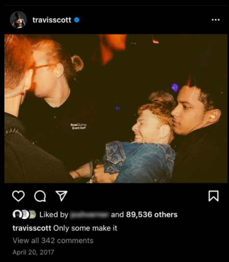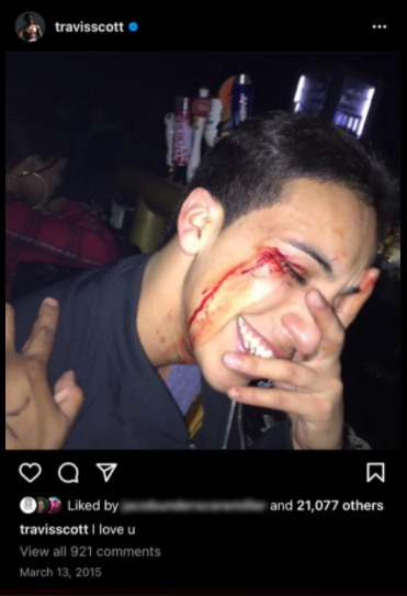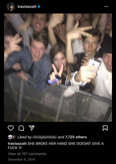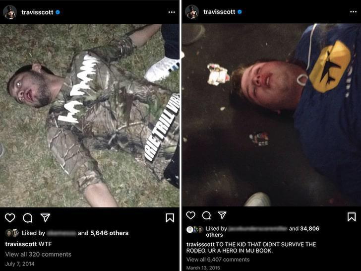 Όπως φαίνεται, ο Τράβις Σκοτ κατά καιρούς φωτογράφιζε και ανέβαζε στο Instagram διάφορους θαυμαστές του, οι οποίοι ήταν εμφανώς τραυματισμένοι. Πολλές φορές, οι άνθρωποι αυτοί τραυματίζονταν στα πλαίσια μιας συναυλίας του ράπερ, ο οποίος, αντί να προβληματίζεται, μάλλον ενθουσιαζόταν με την κατάσταση: