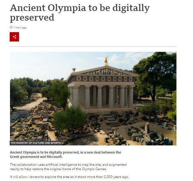 «Η Αρχαία Ολυμπία πρόκειται να διατηρηθεί ψηφιακά, σε νέα συμφωνία μεταξύ της ελληνικής κυβέρνησης και της Microsoft», αναφέρει το BBC.