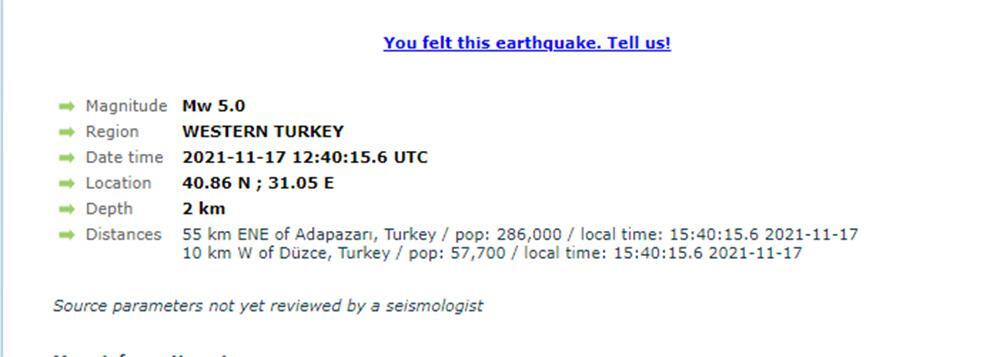 Σύμφωνα με το Ευρωμεσογειακό Σεισμολογικό Κέντρο ο σεισμός σημειώθηκε 55 χιλιόμετρα από την πόλη Adapazarı, βορειοδυτικά της Τουρκίας, ενώ το εστιακό βάθος εντοπίζεται στα 2 χιλιόμετρα.