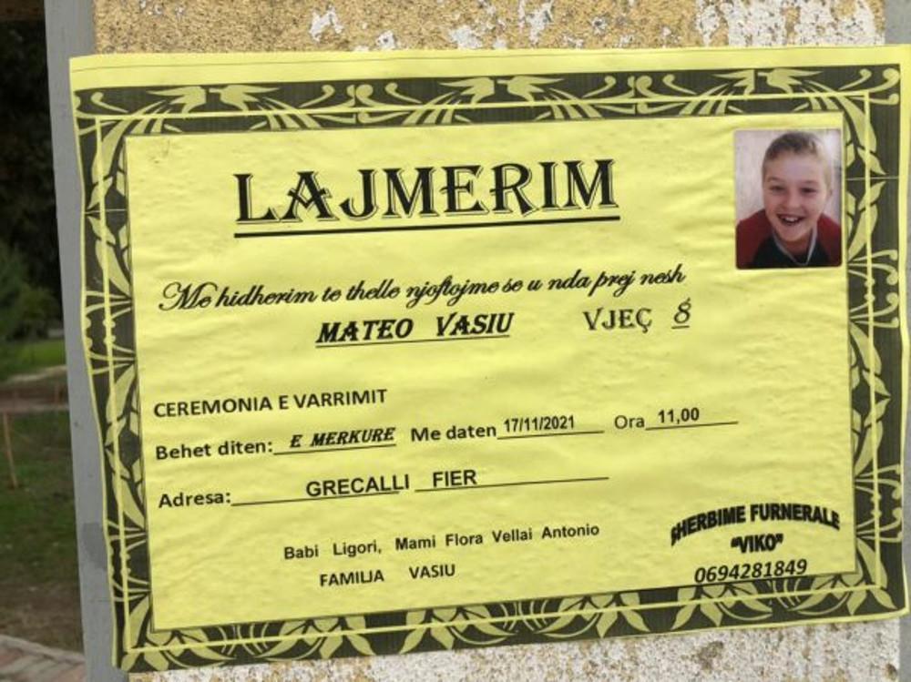 Η κηδεία του άτυχου αγοριού, σύμφωνα με τ’ αλβανικά ΜΜΕ, θα τελεστεί σήμερα στο Γκρετσάλι του Φιέρι, μέσα σε βαρύ κλίμα.
