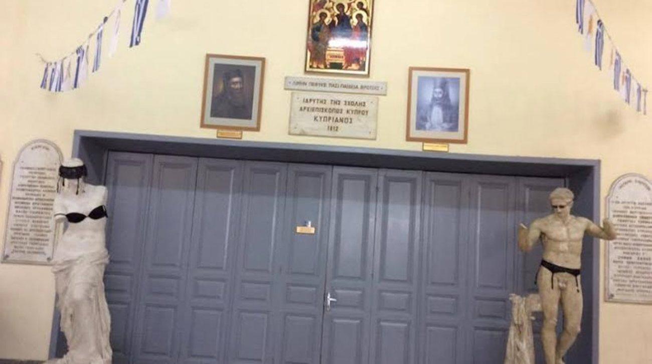 Στο Παγκύπριο Γυμνάσιο της Λευκωσίας θέλησαν να κάνουν ένα… «πείραμα» στο μάθημα της τέχνης και στόλισαν τα αγάλματα με ζαρτιέρες, σουτιέν και προφυλακτικά στο Παγκύπριο Γυμνάσιο της Λευκωσίας.