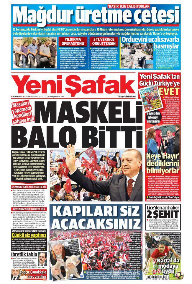 Η YENI SAFAK έχει τίτλο «Το μπαλ μασκέ τελείωσε δεν μπόρεσαν, τα πιόνια τους το κάνουν οι ίδιοι».