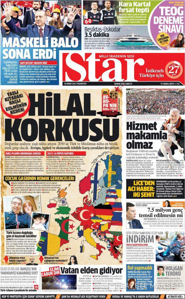 «O φόβος για την ημισέληνο! O λόγος της βαρβαρότητας στην ήπειρο των Σταυροφόρων η οποία γερνάει». Η φιλοκυβερνητική εφημερίδα «Star» αναφέρεται στη μείωση του πληθυσμού της Ευρώπης δείχνει όλη την κεντρική Ευρώπη με τουρκικές και αραβικές σημαίες και την Ελλάδα με Αλβανική σημαία.