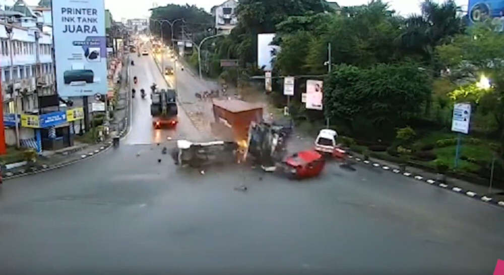 Ένα φορτηγό που μετέφερε εμπορευματοκιβώτια, το οποίο κινούνταν σε κατηφορικό δρόμο, παρέσυρε αυτοκίνητα και μοτοσικλέτες που ήταν σταματημένα σε κόκκινο σηματοδότη.